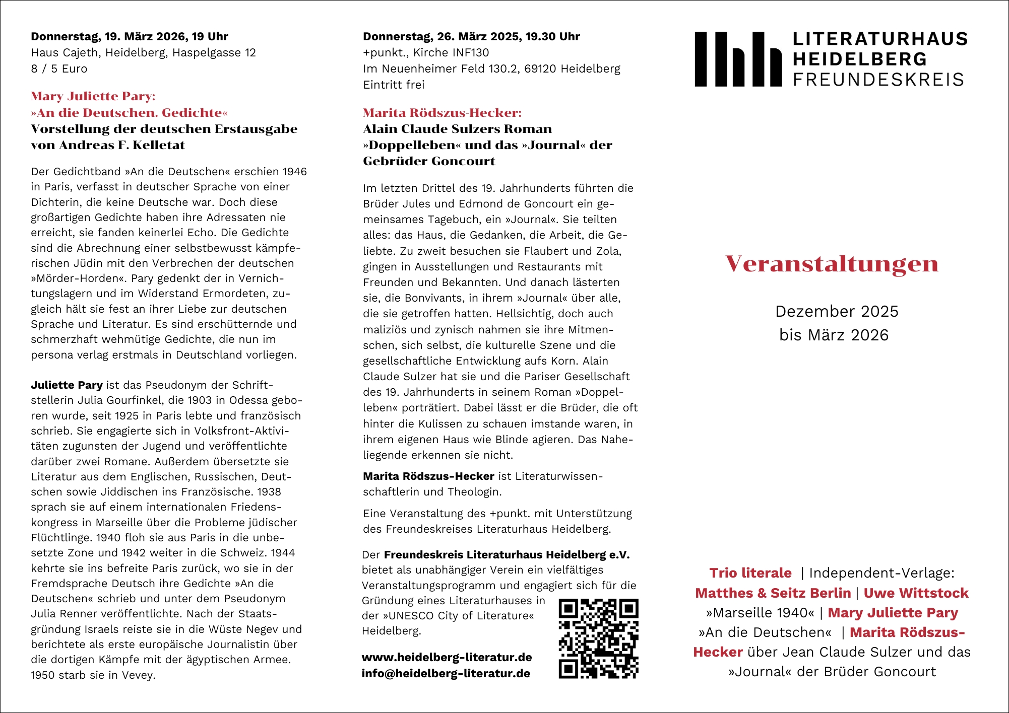 Der Freundeskreis Literaturhaus Heidelberg bietet als unabhängiger Verein ein vielfältiges Veranstaltungsprogramm und verfolgt die Gründung eines Literaturhauses in der »UNESCO City of Literature« Heidelberg. Mehr